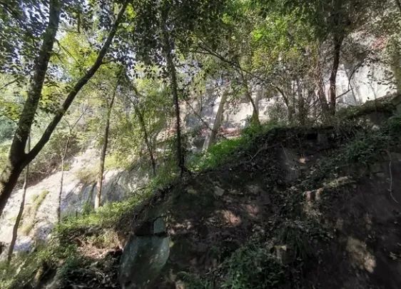 今虽不见“绿竹”,但“滴水岩”仍在,据其地形地貌仍可想见古人咏赞的“断岸千尺,飞流直下,如练如簾,如雾如烟”之美景。紧挨“滴水岩”上方,修建有“荡胸湖”。因修湖之故,“滴水岩”石壁已做护坡加固处理,但看上去仍然常年流水浸润,坡度接近垂直,高近30余米。据此可判断,此地曾经水源丰盈,若非人力蓄水,当有飞瀑直下。