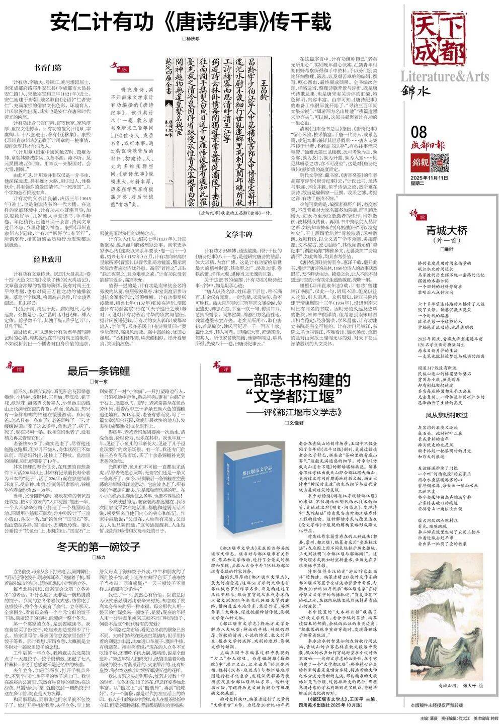翻阅完厚厚的,最大的感受是:这部51万字的文学志并非机械地罗列作家名录,而是构建起了三维坐标系:纵向贯穿起从秦代李冰治水铭文到2024年新生代网络文学的脉络,横向覆盖本地作家、寓居作家、游历作家三大群体,深度挖掘神话传说、影视文学等八种文体。