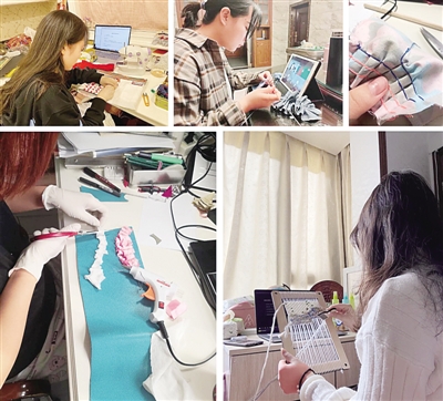清华大学美术学院染织服装艺术设计系同学们利用有限的材料、工具动手实践,完成作业。