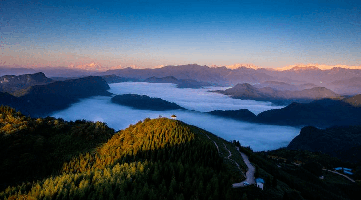 芦山县漏斗云海,远处是贡嘎雪山,在朝霞的映衬下金碧辉煌,宛如一座金山(图片来源:李年龙的美篇)
