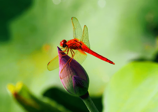 蜻蜓来回游耍于荷花顶尖