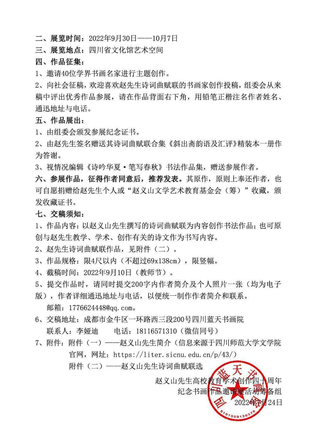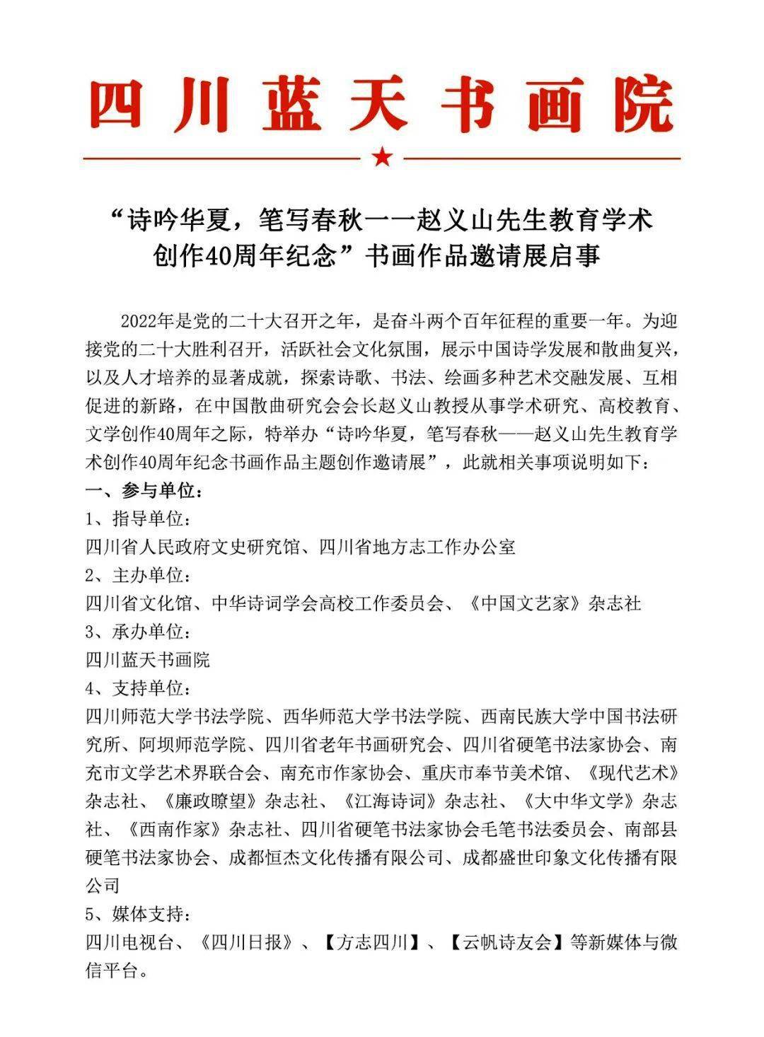为迎接党的二十大胜利召开,活跃社会文化氛围,展示中国诗学发展、散曲复兴以及人才培养的显著成就,探索诗歌、书法、绘画多种艺术交融发展、互相促进的新路,在中国散曲研究会会长赵义山教授从事学术研究、高校教育、文学创作40周年之际,由四川省地方志工作办公室、中国散曲研究会指导,四川省文化馆、中华诗词学会高校工作委员会、《中国文艺家》杂志社主办,四川蓝天书画院承办的“诗吟华夏 笔写春秋——赵义山先生教育学术创作40周年纪念书画作品主题创作邀请展”,将于2022年9月30日至10月7日在四川省文化馆艺术空间举行。