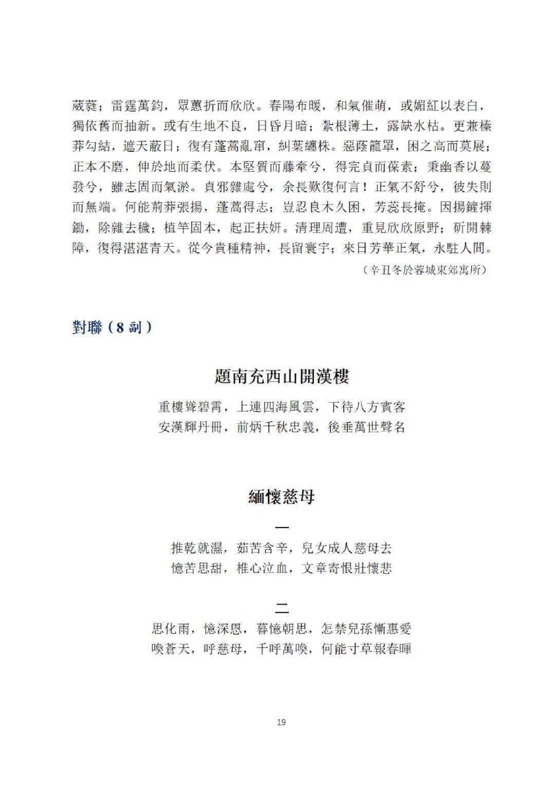 教学、科研与人才培养之余,热爱文学创作,四十多年来,积诗、词、曲、赋、文凡五百余首(篇)。三十年前出版过诗词曲合集《雪石集》。其创作虽多以即事抒怀为主,但“文章合为时而著,歌诗合为事而作”则是其一贯宗旨,故得到同行和读者广泛喜爱与好评。近年来提出在传统诗词曲复兴的基础上创建新体的十六字方针:融汇新旧,打通古今,创建新体,诗乐联姻。拟联合全国诗词曲创作、演唱、评论、传播等各方面优秀人才,为创建新的“第四大诗体”,复兴中华歌诗的传统而共同努力。