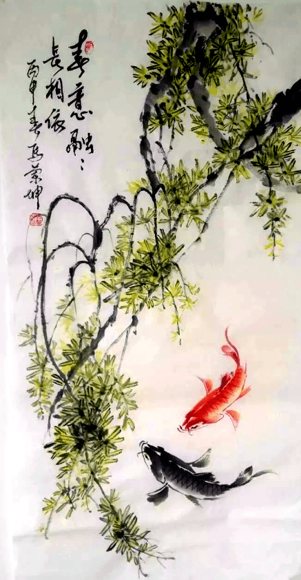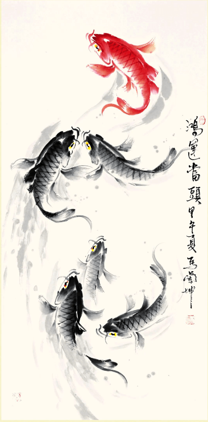 中国画,不论山水、花鸟、鱼虫类题材作品,经常提款命名为《鸿运当头》,主要是为迎合中国人的民俗文化“吉祥语”。在家中悬挂一幅画作,不只是收藏那么简单,装饰以及其寓意都很重要。特别是寓意,因为现在家居悬挂书画艺术品已成常态,书画艺术品也不再是部分人的玩品,而是所有民众家居装饰的必需。马兰坤先生笔下的大鱼重气势、力度、神态、质感、灵动可爱,喜庆吉祥。大红大紫,设色大胆、厚重,但艳丽而不俗;他笔下的小鱼,或自由翱翔,或翻腾跳跃,或怡然自得,或成群嘻戏。笔墨精到,行神兼备,意境清新,顾盼有致;继承之中发展,已渐成个人独特风格。
