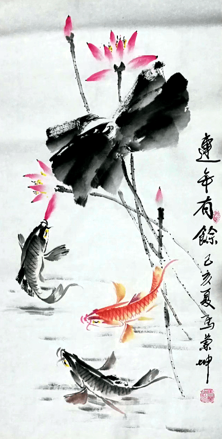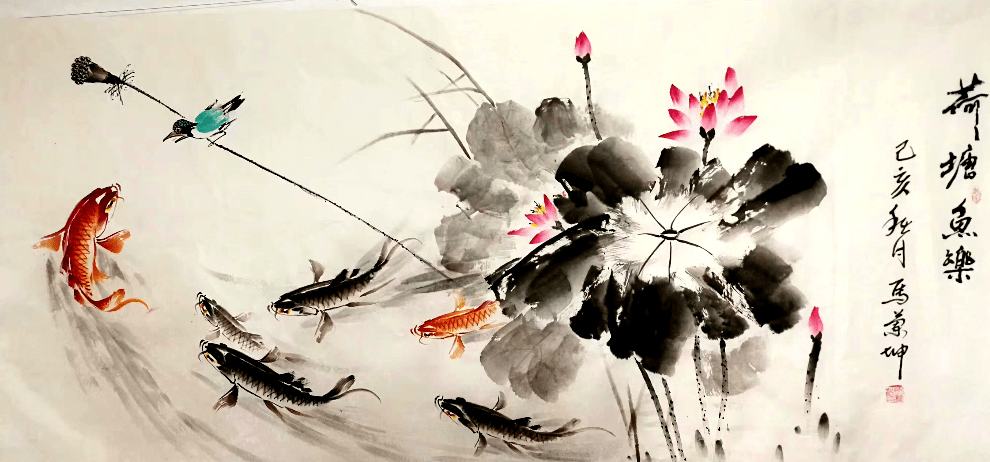 而在马兰坤先生的鱼画作品中,让人体会到风随草动乃物语常态下的美感的同时,更为作品中所呈现出的淡淡清香所感染,“江南可采莲,莲叶何田田,鱼戏莲叶间。鱼戏莲叶东,鱼戏莲叶西,鱼戏莲叶南,鱼戏莲叶北。”他笔下的鱼是可以细细品味的,把唐代文学家柳宗元的《小石谭记》中“潭中鱼可百许头,皆若空游无所依”的景象表现得活灵活现,虽没画水,却见鱼如水中游,有“山水收眼底,诗意在画中”的意境。鱼儿在他的笔下是如此的灵动、欢快,画意与诗境相互印证,艺术的魅力是自然生命的延续与升华,精细的线条描绘出一个生动的世界,使画面气韵生动、醇厚有味、意境浓郁、层次丰富,使得自然景色、艺术表现手法和谐统一,呈现出诗情画意的艺术界。