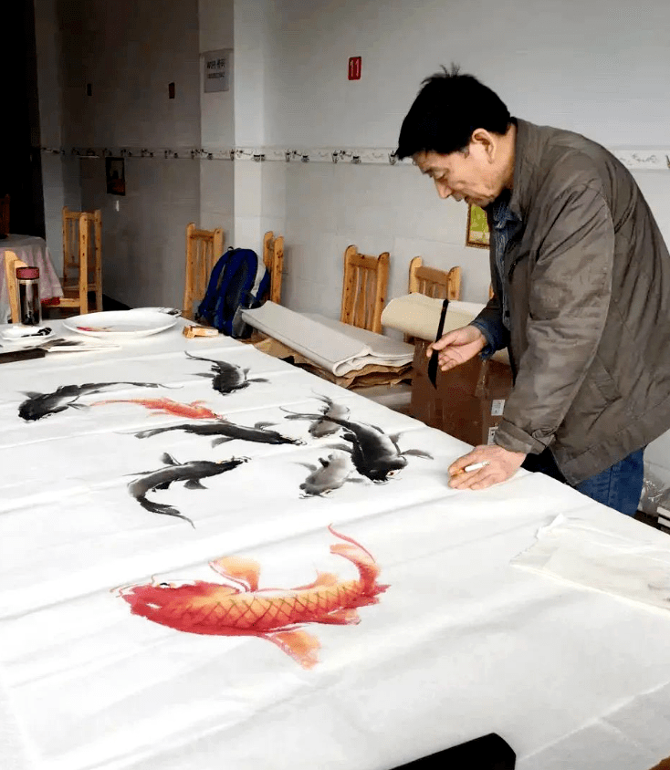 先生主张取法古意,并有所创新。坚持“外师造化,中得心寰”,注意观察,重视写生。游目骋怀之际,每有会意,辄解衣磐礴,振笔速写,挥毫而画,忘乎所以。为了画好鱼,他不仅自己在家里养了各种各样的鱼,而且经常到河塘池边垂钓,陶醉于桃花流水,鹭飞鱼肥的田园风光,随时记下鱼态鱼性的印象。故有人形容他“天天在河岸边观察、日日在墨海里垂钓”。日久天长,先生发现水中的游鱼往往只现其头和脊而难见其尾,所以画鱼尾时尽量少用笔墨。经过反复揣摩和练习,为更好地体现水中游鱼的动态,他发明了令人叫绝的“一笔画鱼”技法,实现了画鱼史上画鱼技法的重大突破。