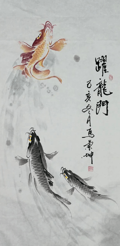 马兰坤先生尤喜画鲤鱼,认为鲤鱼同自己一样,也是同类中的“孤勇者”。在他看来,鲤鱼饱含着勤劳勇敢、热爱和平的品性,因为再大的它们也不吃小鱼,是善物,也是中国传统吉祥的象征;“鲤鱼跳龙门”的传说便是中高第、交好运、飞黄腾达的象征。我想,或许正是鲤鱼的品性,体现了中国人质朴善良、勤劳勇敢、厚德载物、热爱和平的美德,也饱含着华夏思想之精萃,才让先生为之入迷吧?!