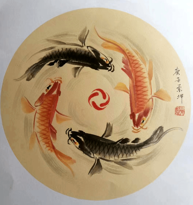 《如鱼得水,四季招财》,构图为圆形,红青鱼各2条,大家聚首一块,一如多年不见的好友久别重逢,又像是彼此才认识的朋友相见恨晚,大有“一相逢便胜却人间无数”的诗韵。画作揭示自然界社会中总有不同的事,不同的人,大家“因缘”融合,和谐共存共生共荣。