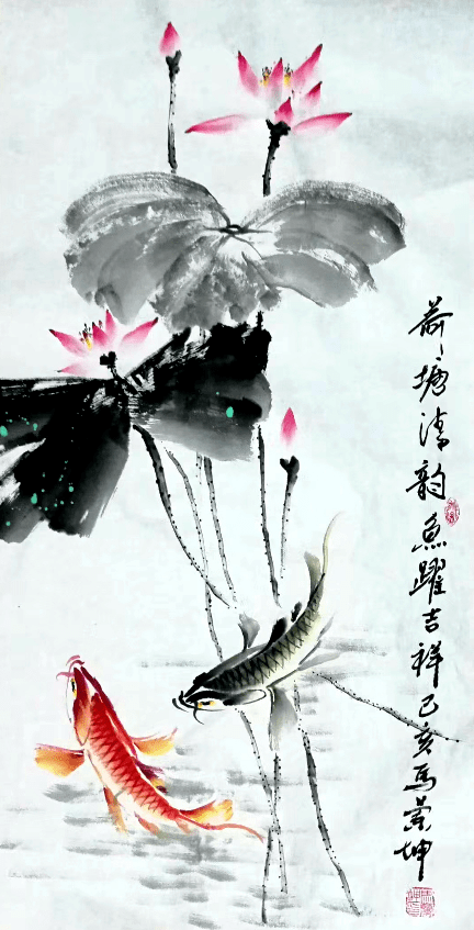 又如《春意融融长相依》,画面上杨柳青青,两条鱼,一红一青,它们或是一对情侣或是父子、母女俩纠纠缠缠,爱意亲情,淋漓尽致,让人感动得想哭。《荷塘清韵》,4荷花一对正绽一对含蕾,而塘中也是一红一青两鱼结伴而游,正可以挂在新婚的房间,提示夫妻二人不忘初心,风雨同舟,执手百年。