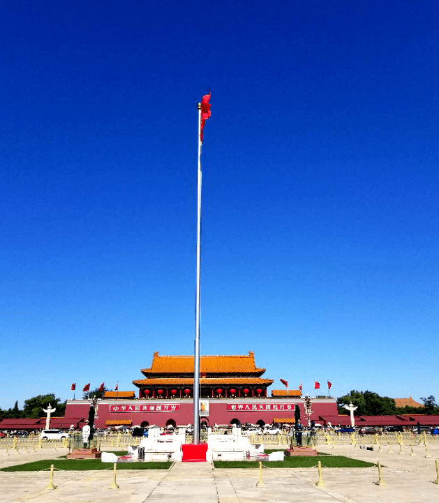 站在天安门广场上,抬头仰望着城楼,看着迎风飘扬的五星红旗,仿佛历史重演,电影电视中开国大典的情景浮现在眼前:回到1949年10月1日,毛泽东主席站在城楼上,庄严、自豪而骄傲地宣告中华人民共和国成立了的那一刻,仿佛自己也是广场上群众中的一员,站在他们中间,与他们一起欢呼,一起挥手,那场景感同身受,如身临其境一般,喜悦、激动、自豪,各种混杂的情感无以言表。那场面是如此的壮观、宏伟、振奋人心,令人心潮澎湃。在这一刻,在这座城楼上、这个广场上,宣告新中国的成立,是何等的来之不易。再仰视矗立在广场上的人民英雄纪念碑,心情沉重,从虎门销烟到新中国成立,透过历史看到无数革命先烈用自己的热血为我们铺就了今天的新生活。“人民英雄永垂不朽”八个大字,字字千钧,压在心头,永远铭记。