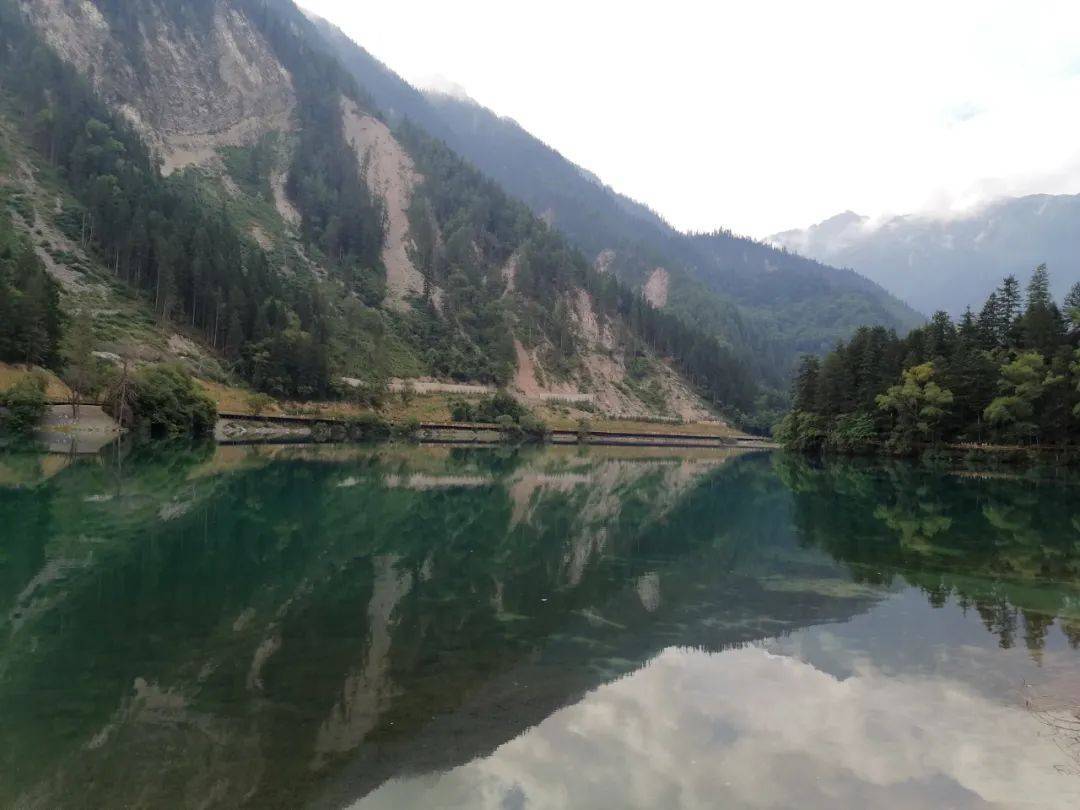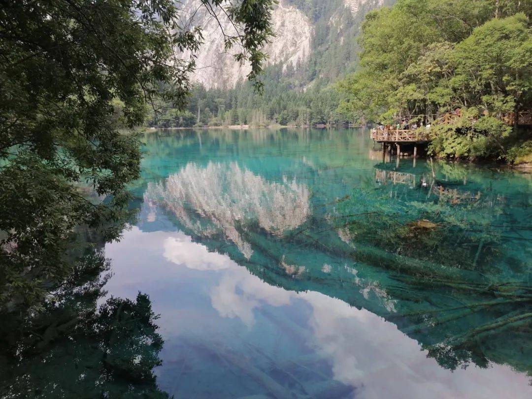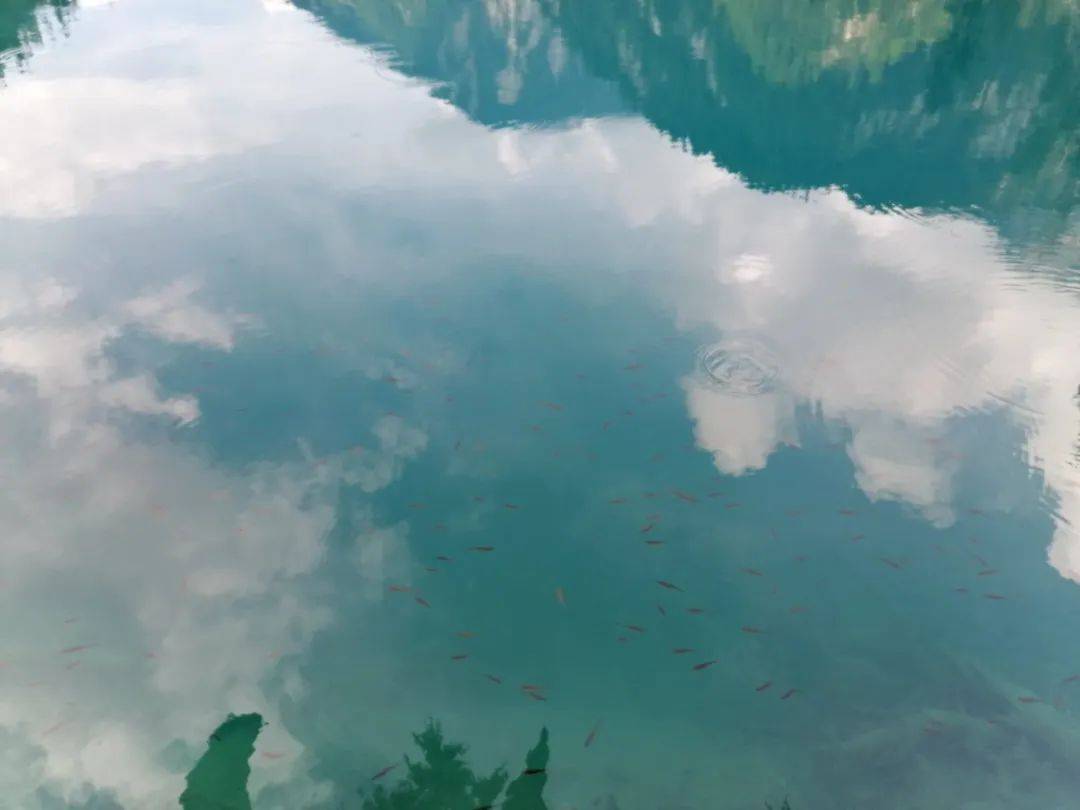 继续前行,过了珍珠滩,就是九寨沟著名景点镜海了。蓝天、白云,远山,近树,轮廓分明,尽收海底,恰海面无风,令我想起了刘禹锡的《望洞庭》,“无风镜未磨”也许就是这个样子吧。最喜人的还是海里的冷水鱼,东边一群,西边一串,无忧无虑,悠哉游哉。不禁感慨:遥望碧空洗如练,近看叠翠映溪沟。水满青山山连水,鱼戏五彩彩穿云。