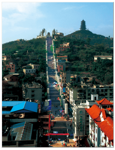 天梯在城南的老城区,从市区依山而上。脚下是各种商店,打折促销的广播此起彼伏,街边上到处摆着卖手工和小吃的地摊,人不怎么多,道路看起来比以前窄了一些,有点乱糟糟的。