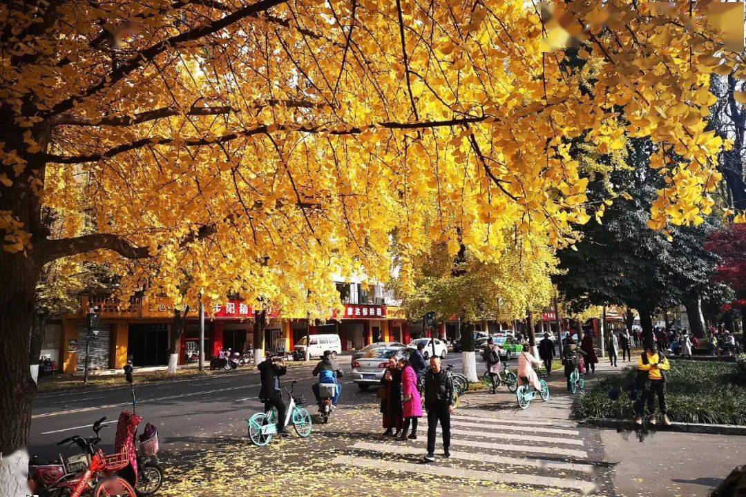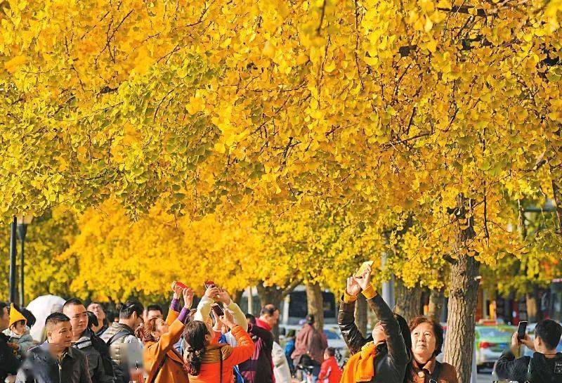 成都市锦里中路绵延的银杏美景,吸引不少市民拿出手机拍照留念(四川日报记者 何海洋 摄,图片来源:四川日报)