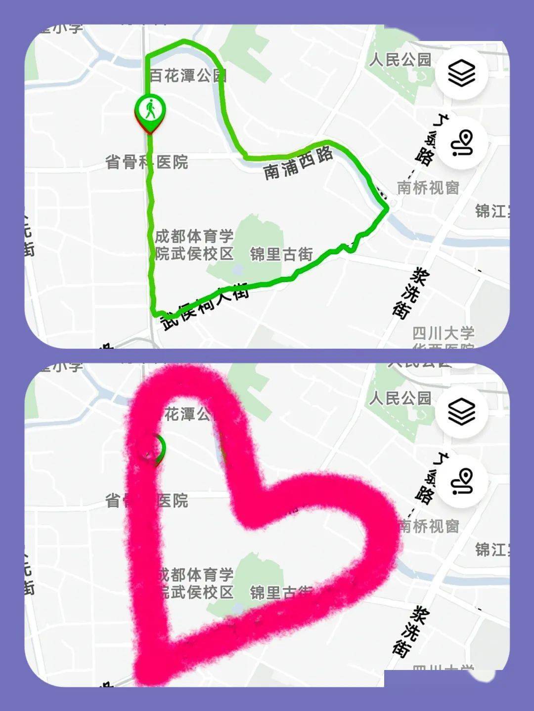 很久以前,偶然之间,看到一篇推文。大意是,在成都西边,从四川省社科院大门口出发,沿一环路向右,沿着锦江河道再到武侯大街,经过锦里武侯祠体育学院,再回到社科院,这样一条步行路线,可以走出一颗心型图案。那一刻,我就被种草了,期待自己在某一天,也可以去走走,“画”下一颗属于自己的心。