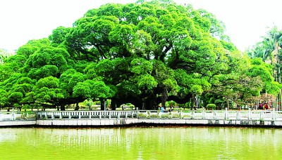 拥有古树的城市就是拥有历史的城市。福州古榕遍布,四季常青,是城市、市民生活与树木的完美结合,是风景的自然生长,是历史根深叶茂地屹立。福州古榕以树龄长、历史久、数量众而著称。见证福州城市史的,当首推鼓山国家森林公园、八一水库旁,福州无人不知的已近千岁,被誉为福州榕树王的古榕。相传,这棵古榕是张伯玉所栽植的两棵树苖,光阴荏苒,同气相求,如今两棵榕树相互纠结、勾连、缠绕、亲密,已无分彼此。其冠幅达1300米,可容纳千人在树下谈古论今,聊天遮阴。远望,似绿色陵岩;近看,知其为榕也,密密的枝叶把近午的阳光切割成碎花点,散落、闪亮在榕树下的草坪和地衣上。初访者或为讶异:偌大一棵古榕却不见气根,知榕者会告诉你,这是一株硕大、古老而不生气根的细叶榕。因其冠幅日益长大,为了支撑沉重的树冠、预防主干折损,便制作了若干石柱,砥柱其间。古榕下有湖塘,锦鲤游泳,不时生出红色涟漪。旁有一碑,上刻:榕荫照水波心漾,观鱼犹胜花间行。
