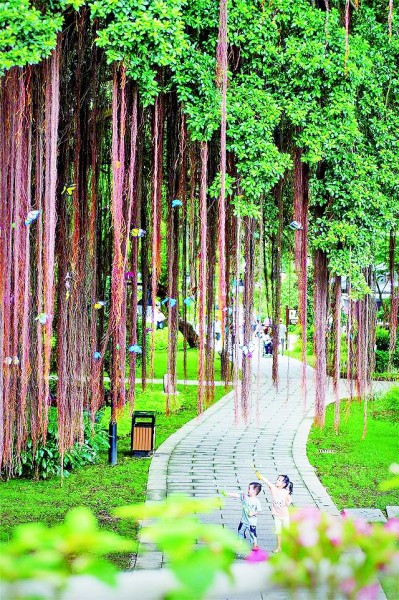 两名儿童在福州市江心公园里的榕树下玩耍。新华社发