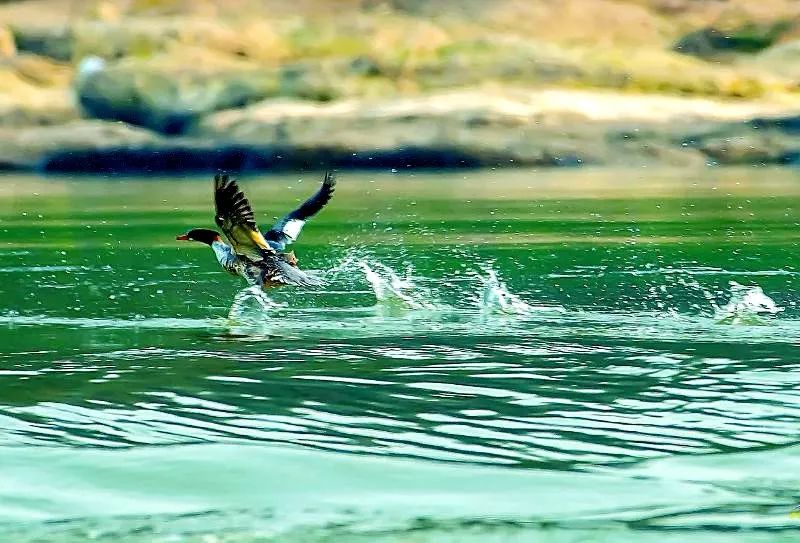 沱江江面上扑腾的中华秋沙鸭(王斌 摄,图片来源:四川日报)