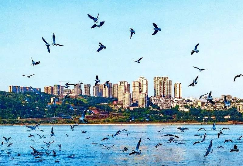 红嘴鸥在泸州江面嬉戏(李峰 摄,图片来源:四川日报)