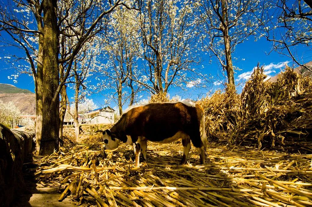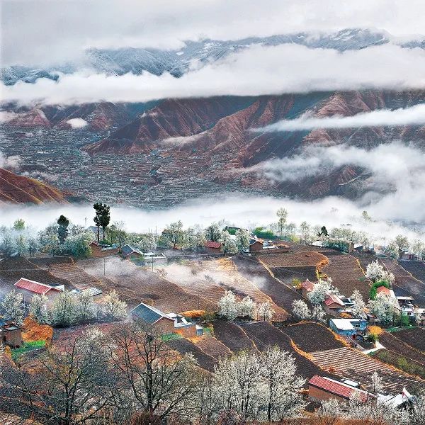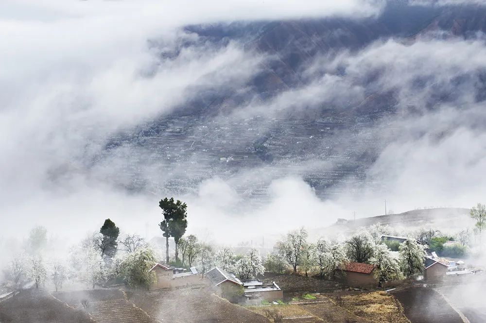 梨花的怒放,梨花的挤攘,梨花的壅塞,在这片高原上、河川里滚滚向前,就像春天冰河炸裂。漫天纷飞的花语,属于云朵之下的善良人民。