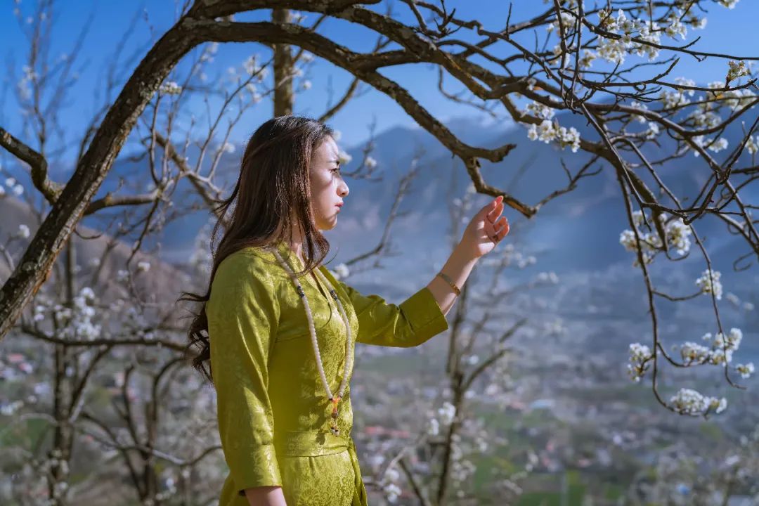 那几乎透明的花瓣,细小精致的花蕊,有黄,有红,有绿,以微小的光芒组成汹涌的火树,点亮这片吉祥的天空。在夜晚,它是一万个月亮照耀下的银色河川,这些白色的精灵纵情劲舞,跳跃和奔泻在梦里,被河水拉曳成银色的星空。火焰相互串联的秘语,遵循着高原季节的召唤,一瞬间喷发如春雪。煨桑祈福的烟火和村庄的炊烟汇合,从花缝里钻出来,流溢和洇染在梨树林、古碉和藏式小楼之上,这袅袅的、慵懒的、牧歌般的自在日子,让这里的人民如此幸福地陶醉在静谧如童话的梨花园里,令人艳羡。