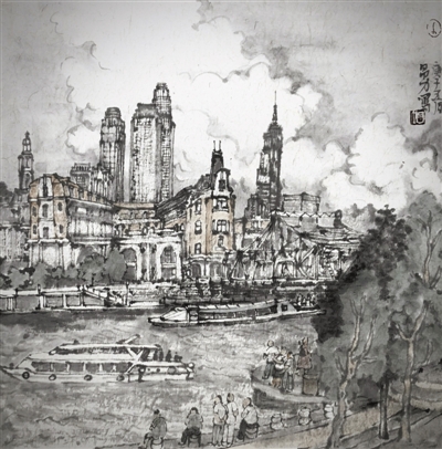 韩昌力中国画《海河风情》:天津自古便因漕运而兴,海河更是其精神的象征和历史的见证,而今已形成独具特色的城市服务型经济带。随着游船的行进,旖旎风光尽收眼底,历史文化尽入胸怀。