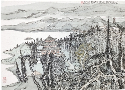 张文华中国画《幸福家园》:承载了悠悠历史的永定河,对于北京的居民来说有着众多象征意义。而今,永定河碧波映着白云,永定楼对着山色,倚栏而坐,心灵于历史和山水间畅游,正是幸福时刻。