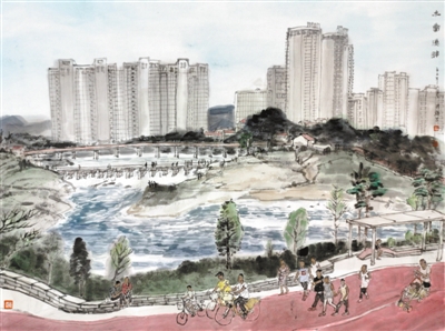 徐国雄中国画《木兰溪畔》:河水潺潺,岸边青绿,错落有致的建筑、石椅、亭榭和健身道,构筑滨水新空间。作为莆田人心中最美家乡河,悠悠木兰溪承载着乡愁,奔涌着希望。