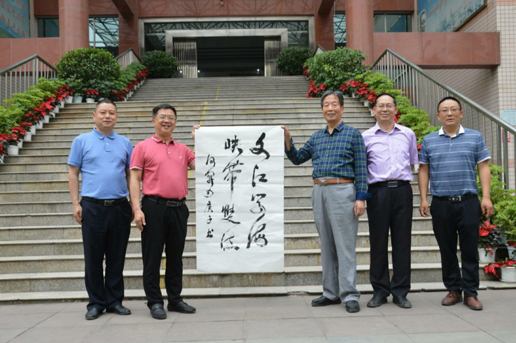 2020年5月13日,何开四先生(右三)即兴挥毫,书赠四川省双流中学 “文江学海,映带双流”条幅 ( 左二为四川省双流中学校长龙清明,杨明强 供图)