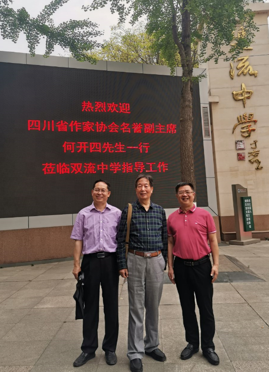 2020年5月13日,何开四先生(中)与本文作者杨明强(左一)、四川省双流中学校长龙清明(右一)合影留念(杨明强 供图)