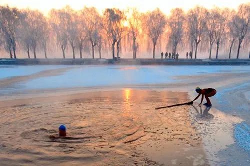 寒光铁衣迎风啸,泳者锋刃已收鞘。