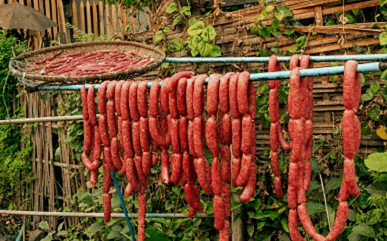 回到家,我小心地把香肠拿出来,用鞋底针扎一些小眼,挂在阳台的防护栏上就万事大吉了。