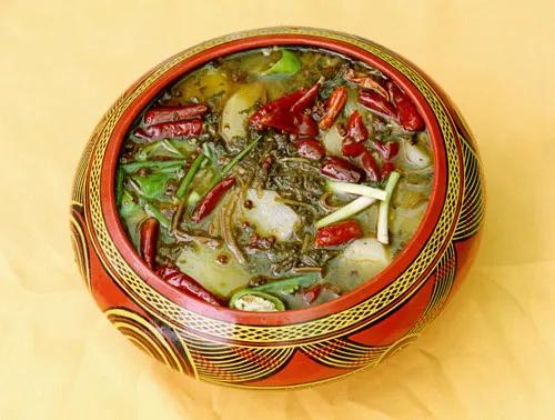 圆根萝卜、青菜一般都生长在海拔1800米以上的高寒山区,是绿色植物,味道纯正,色泽美观。干酸菜汤热天喝,可解暑、止渴、开胃。干酸菜还可制成酸汤土豆、酸汤豆腐,这些菜都会因加人酸菜这种独特的佐料而变得味道鲜美,让人食欲大增。纯酸菜直接放入锑锅内煮成酸菜汤食用,也非常可口。