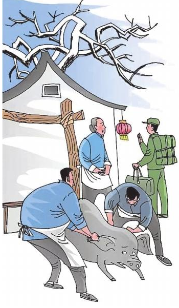 抓猪是有技巧的,猪圈的空间狭窄,想要把年猪顺利抓住,必须先把它轰出猪圈。那时候,我最爱看杀猪时的场景了,杀猪匠用的是巧劲,杀猪的师傅,把猪赶出来,一个人迎头一拦,另一个人往身上一扑猪就倒下了,然后两个人分前后各捉两只蹄子,双手一提溜就把猪扳到凳子上,只见屠工拿出杀猪刀来,用大指拇轻轻地刮刮刀锋,刀锋泛着青光,杀猪匠习惯性地用手试过刀锋之后,再用布在刀刃上擦拭几下,就把刀迅速准确地斜插进猪的脖子,直至刀柄。猪开始沉闷凄惨的嚎叫,大木盘里装满了猪血。年猪经过一阵抽搐之后,血愈流愈少,年猪也就走到了生命尽头。屠工开始烫猪刮毛,吹气,敲打猪皮,一边舀起锅里的开水淋在猪身上,一边刨着猪毛,烫猪脚、烫猪耳、烫猪背,不一会儿,一头被弄得通体雪白的年猪被大家倒挂起来。