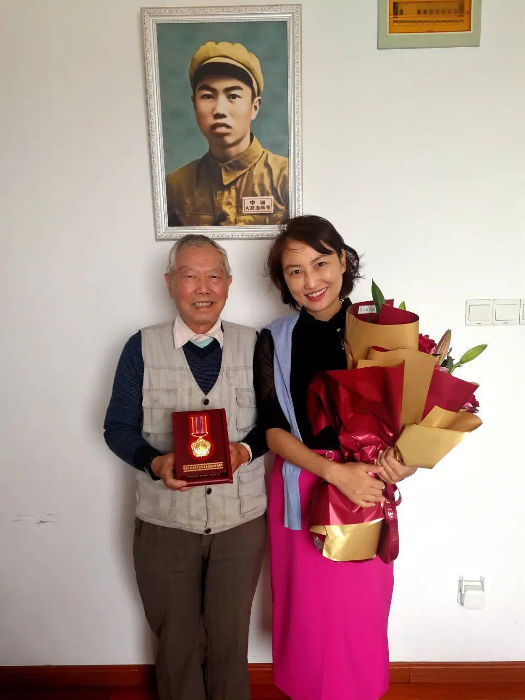 2020年10月23日,宝武集团老干部部长杨芳(右)登门向金国范颁发“中国人民志愿军抗美援朝出国作战70周年”纪念章留影