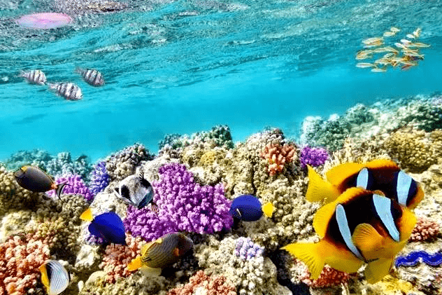 真正在大洋中游泳,是2003年自助赴澳大利亚游览闻名于世的大堡礁。从凯恩斯登上邮轮,每人发了件救生衣和一根塑料管,供游客在离岸20多海里的太平洋中,脸朝下潜浮时呼吸之用。这样即使不会游泳者,也能戴上泳镜,飘在洋面上仔细观看水下五颜六色形状各异的珊瑚礁。当我与身边大小不一不知其名的、美丽鲜艳的热带鱼共同遨游于阳光直射清澈透明无污染高能见度的温暖大洋中,边游泳边观察成千上万年的珊瑚遗骸,欣赏宇宙间大自然的杰作,确系人生中最美妙的时刻之一。