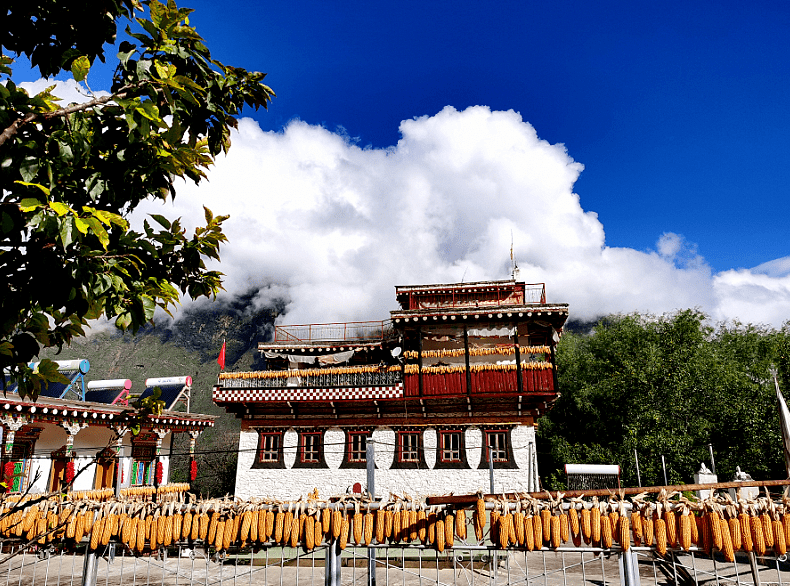 来到半山腰的停车场,远眺正前方,相对平坦的大坝子上,一座座藏寨鳞次栉比,有序排列。白墙,黄瓦,红门窗,靓丽而耀眼,在蓝天白云的衬托之下,甚是惹人怜爱。家家户户的院坝内,挂满了金光灿灿的玉米棒,还有围席铺地晒着的大黄豆、红海椒等秋收农作物。