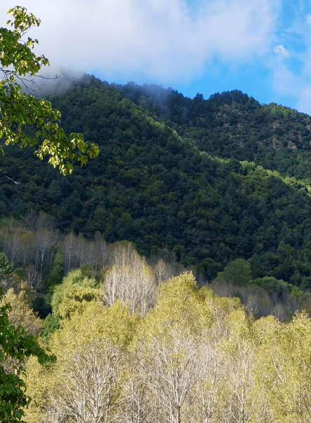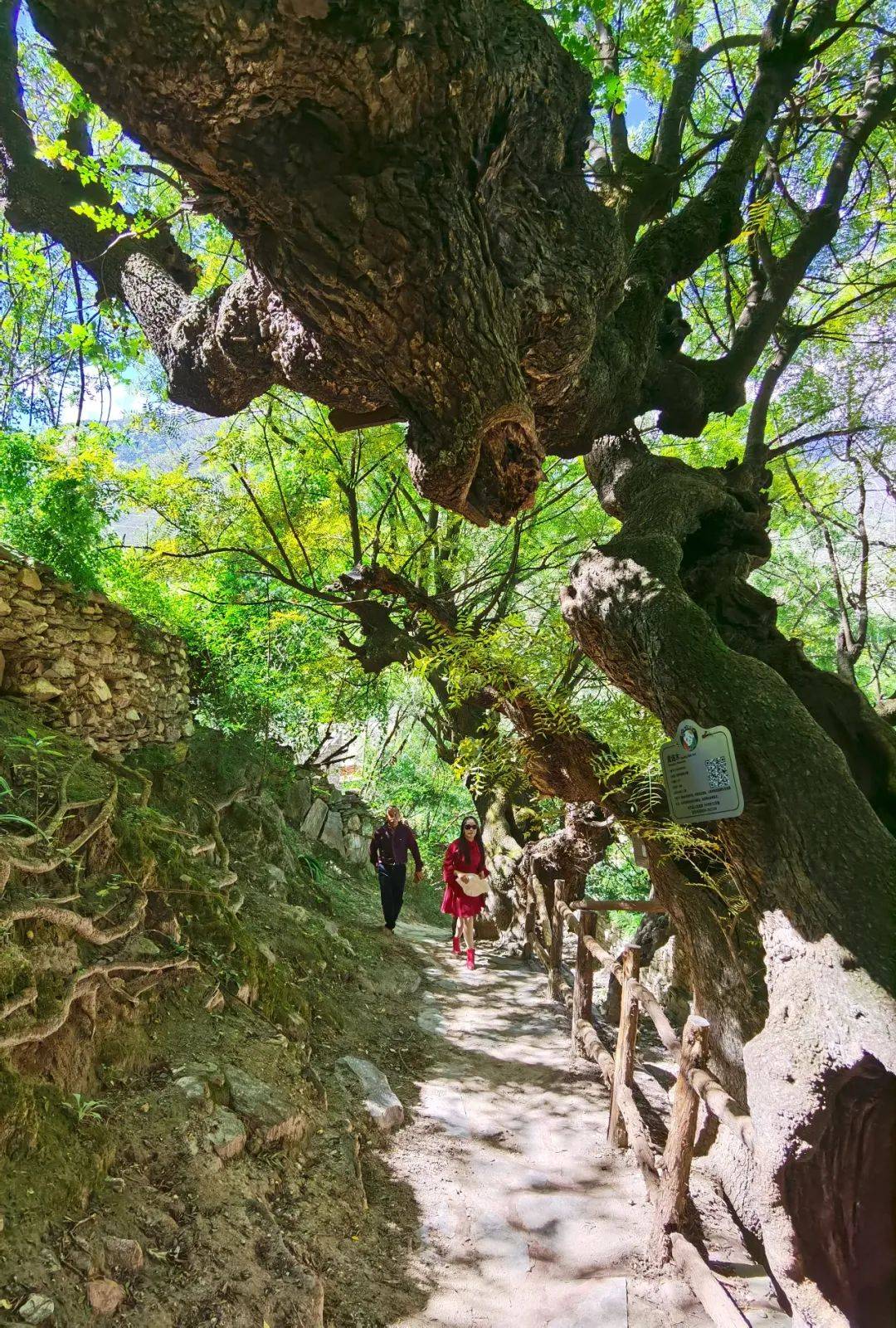 一路拾级攀援而上的古道两边,竟然生长着300多年以上的黄连木古树群。行进中,我们一路惊喜地发现:在这大渡河流域的干热河谷,丹巴县的梭坡乡境内,有一个神奇的莫洛村,坐落在墨尔多神山之半山腰上,密集、挺拔的黄连古树,沿着茶马古道两边繁殖和生长,虽历经数百年风雪侵袭,依苍翠挺拔,生命力旺盛,堪称一道独特的生命风景线。