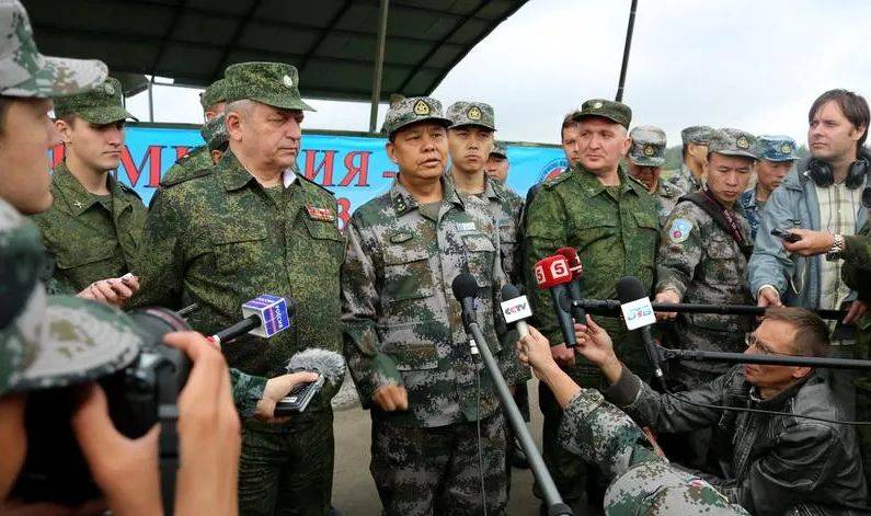 2013年8月3日,“和平使命-2013”联合反恐军事演习中方总导演、沈阳军区副司令员石香元与俄方总导演、俄罗斯中部军区司令伯格诺夫斯基,在此次演习设在切巴尔库尔合同训练场内的野营村共同接受中外记者采访(李祥辉 摄,图片来源:人民网)