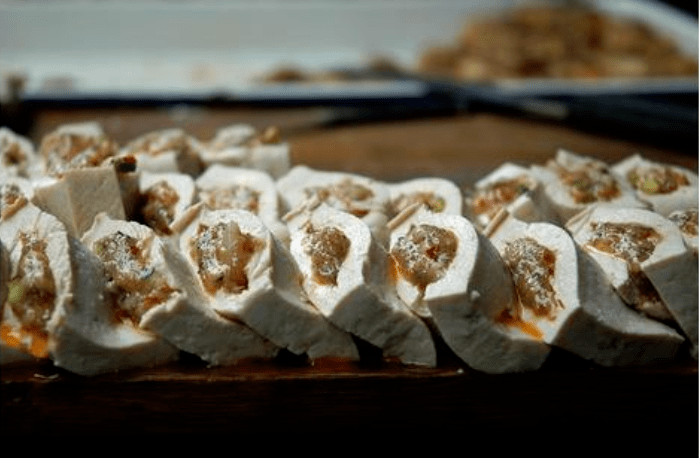 古镇有至味,盛誉遍城乡。山泉盐卤精作,玉色味绵长。久煮油炸不烂,花样饪烹特别,动箸齿留香。景区来宾客,名品更隆昌。