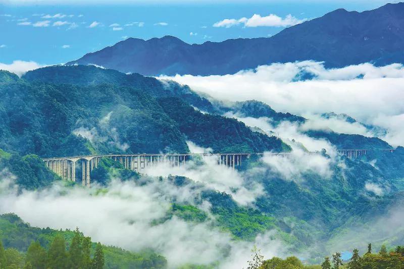 2019年7月22日,在雅安市荥经县,雨后的大相岭空气清新、云瀑空灵,穿梭于云雾之间的雅西高速若隐若现,蔚为壮观( 黄刚 摄,图片来源:四川日报)