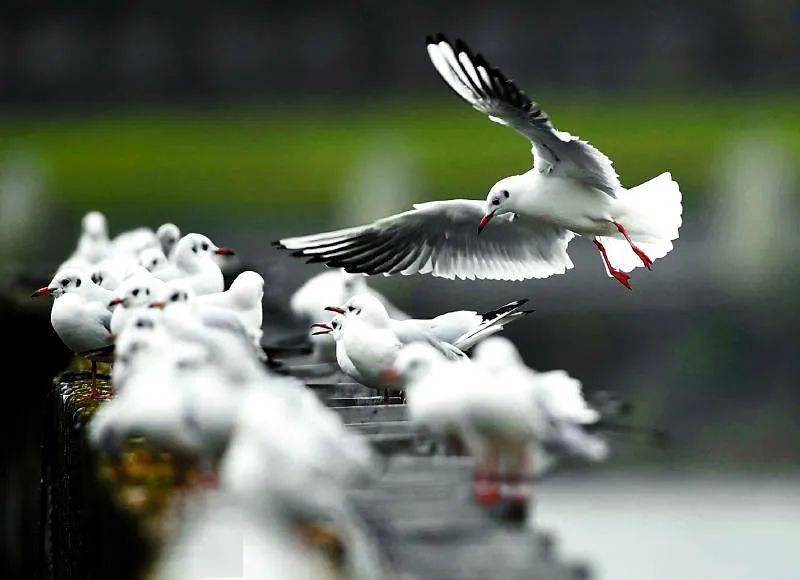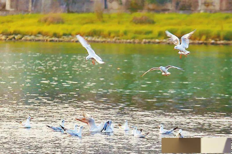 一行人顺着江边绿道边聊边走。天气晴好,沿路有不少在江边观景的人。陪老母亲走到一个江边小公园时,老远就看到公园里围了一大堆人。大人小孩都倚靠着江边石栏,似在观望什么。走近了,才看到,原来是江面上聚集了一大群红嘴白羽的红嘴海鸥。几十只红嘴海鸥在春日照耀下的江面上上下翻飞,正争相啄食人们抛向江面上空的碎馒头。