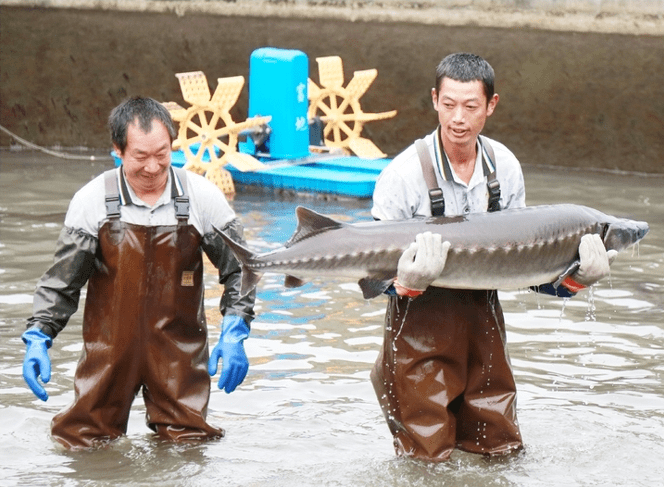 在一个圆形池子内,两个壮汉正在巡抚鱼群。同行的人无不欢呼起来,他们看到了就在眼前缓缓游动的大鱼。那些鲟鱼一个个硕大无比,片片鱼鳞清晰可辨,鱼脊在水中触手可及,它们透着一种自信,兀自游来游去,似在欢迎远道而来的客人。