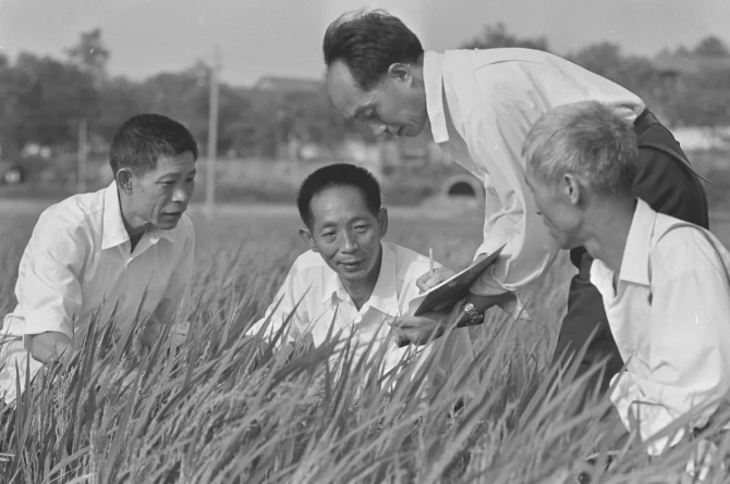 1980年10月,我国第一个研究杂交水稻的育种家、湖南省农业科学院研究员袁隆平(左二),经过10多年刻苦的研究实验,在有关科研单位的协作下,攻克了制种关,使杂交水稻的研究获得全面成功,为水稻增产开辟了新的途径(新华社记者 王平 摄)