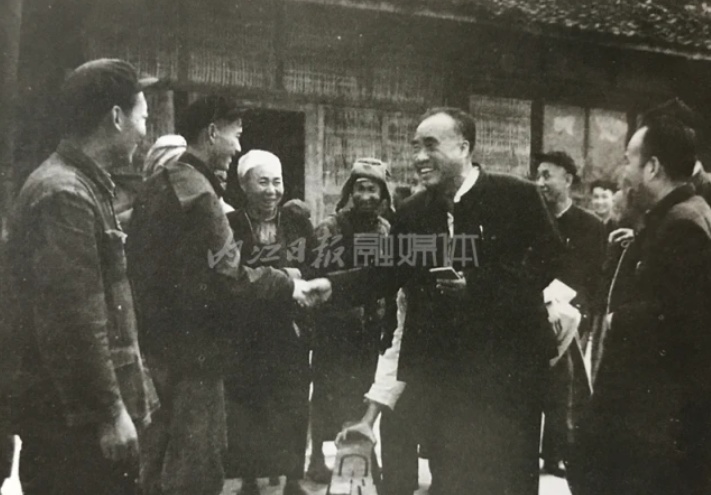 1961年4月17日,朱德(中)在内江市郊椑木公社同农民亲切交谈(图片来源:最 内江)