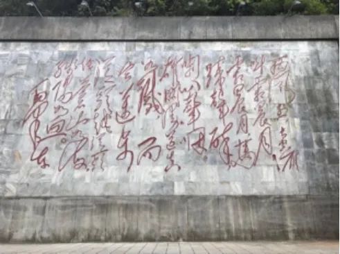 在娄山关景区内一座山体上,镶嵌着一块高14米、宽25米的大理石碑,上面镌刻着毛泽东《忆秦娥·娄山关》一词的手书,全文如下:“西风烈,长空雁叫霜晨月。霜晨月,马蹄声碎,喇叭声咽。雄关漫道真如铁,而今迈步从头越。从头越,苍山如海,残阳如血。”这块石碑,益增雄关声色,引发了我们对一代伟人的深切缅怀。
