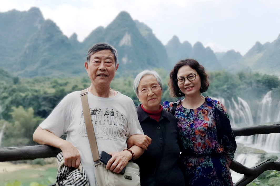 本文作者(右一)柳红樱与来自武汉的叔叔阿姨在广西德天瀑布合影
