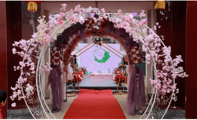 临近正午,新娘的花车和送亲的一辆大巴进入小镇,婚庆活动也进入了高潮。红地毯铺到了花车下,四个女演员围着花车翩翩起舞,欢迎新娘的到来,又陪着新娘给婆婆送见面礼,讨红包。