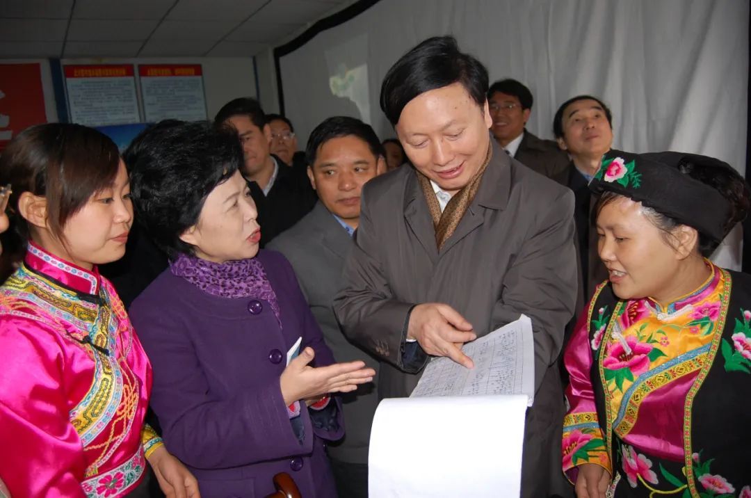 2010年3月24日,在北川县新县城永昌板房图书室,四川省人民政府副省长黄彦蓉(左一)关心李春(右一)的身体状况