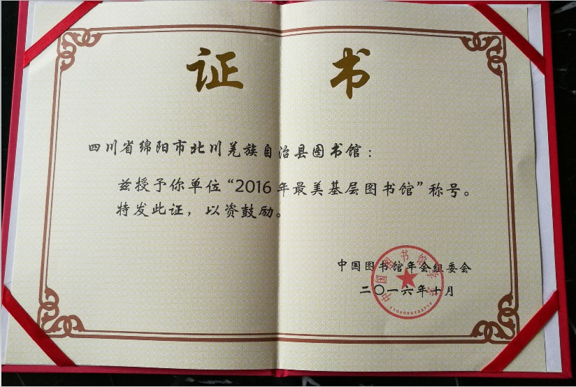 2016年10月,北川县图书馆被中国图书馆年会组委会授予“2016年最美基层图书馆”称号