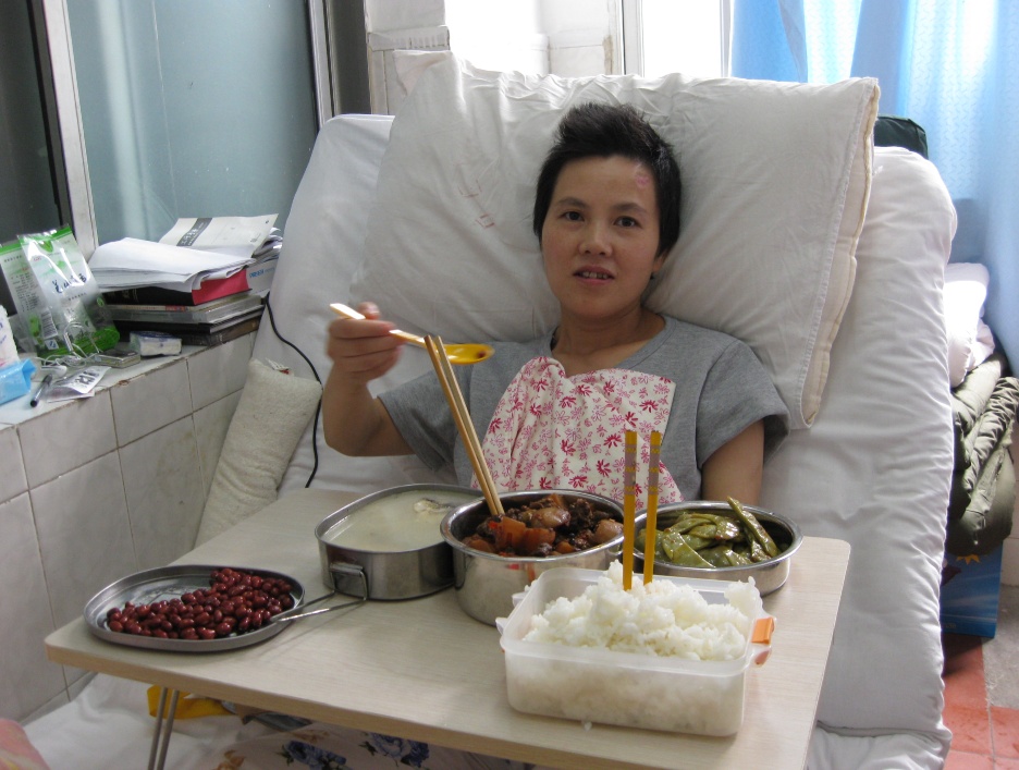手术后我吃不下饭,护士小朱把我的病情告诉了早年下岗的母亲江素红,江大姐每天早晨5点多钟起床,赶菜市采购新鲜蔬菜,变着花样给我做营养早餐:西红柿肝片汤、肉圆子汤、鲫鱼汤、小米粥……给我送到病床前,无论是天晴下雨,每天早晨7点,像闹钟一样准时。